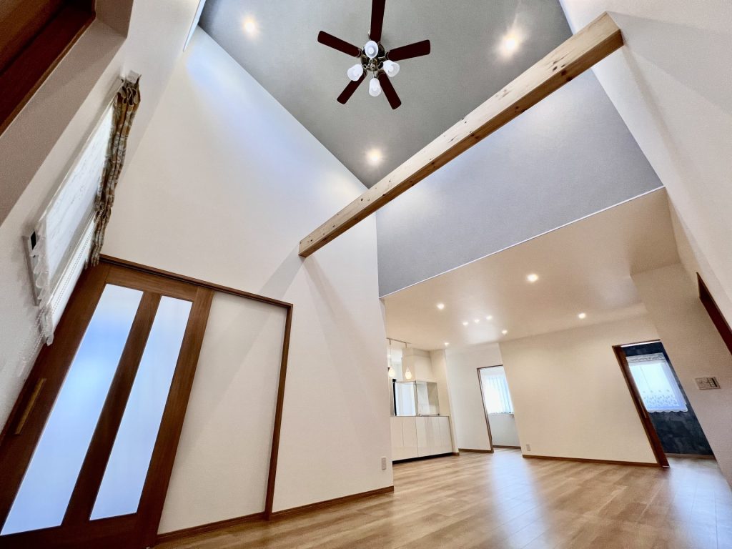 おしゃれ、なだけでなく家事動線が完璧な平屋【LDK】白を基調にまとめた西海岸インテリアが、さわやかで明るい雰囲気。タイルや木など、さまざまな“白の素材”を使用し、表情豊かな空間に仕上がりました。【リビング】勾配天井と上部の窓を配した吹き抜けに