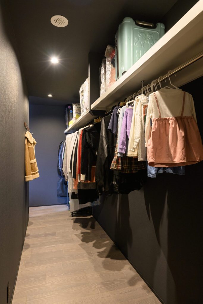 寝室と子供部屋前のホールをつなぐウォークスルークローゼットは、家族全員の衣類をまとめて収納できる便利なスペース。
