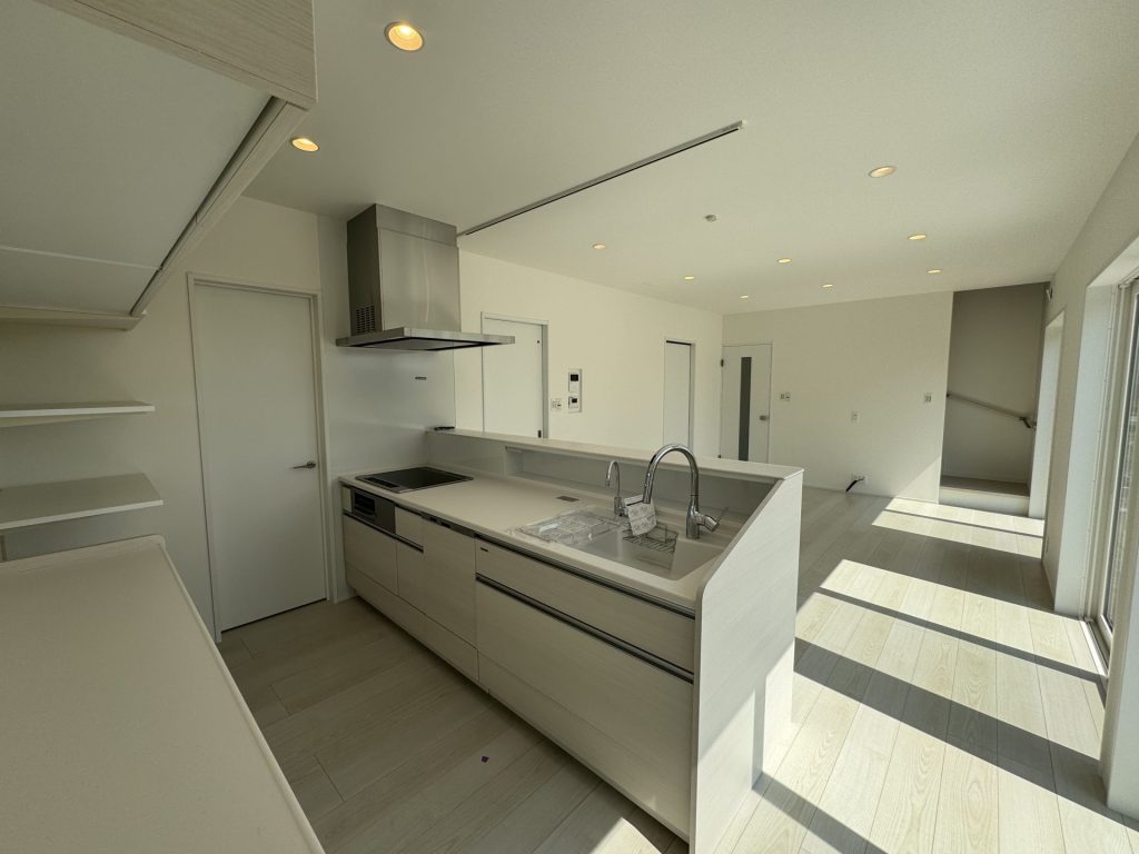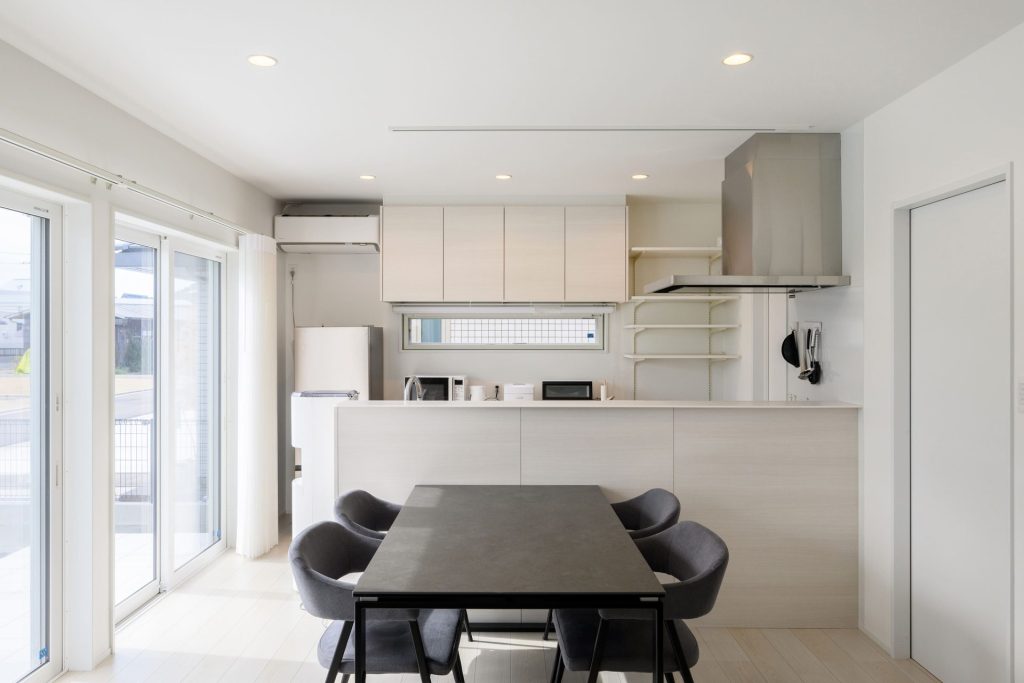 窓から差し込む自然光で、朝は明るく爽やかに、夕方はやわらかな陰影が広がり、一日を通して表情の変わる心地よい空間です。