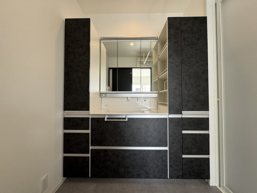 洗練されたブラックカラーが印象的なシステム洗面台は、見た目の美しさだけでなく収納力の高さも大きな魅力。